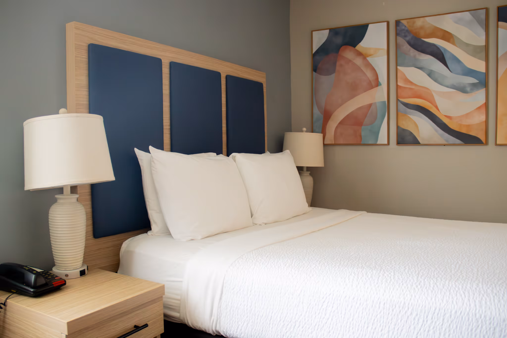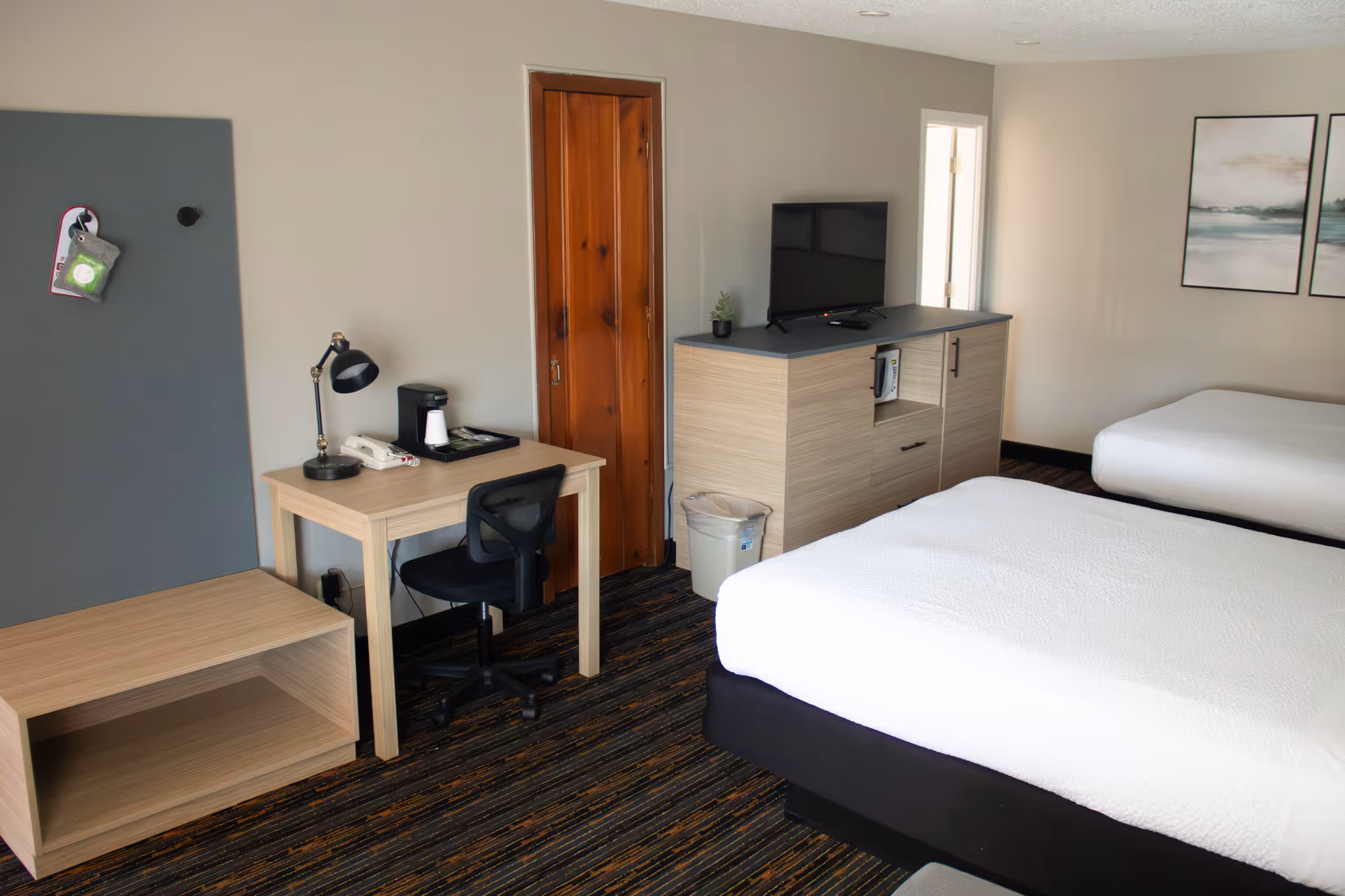 Our contemporary guest rooms feature modern amenities designed for your comfort and convenience. Each room includes plush bedding, work desk, flat-screen TV, refrigerator, microwave, and coffee maker to make your stay feel like home.